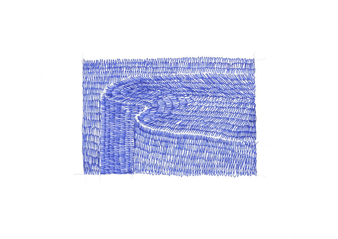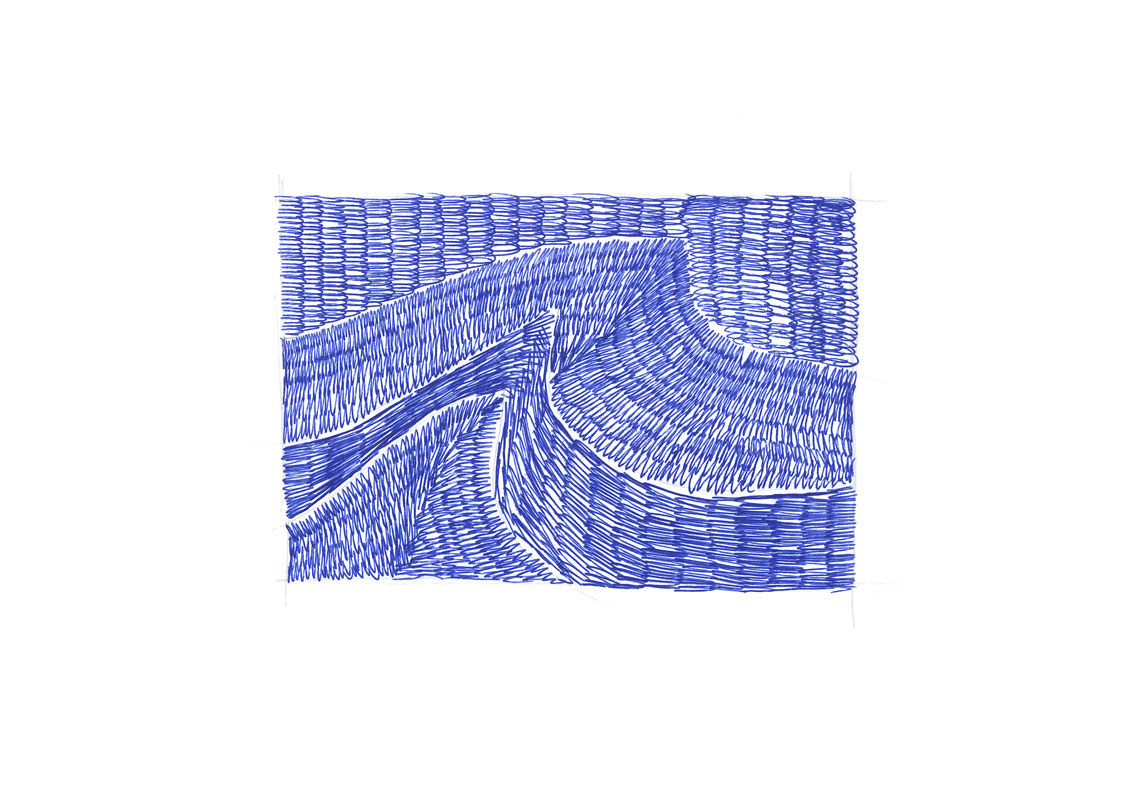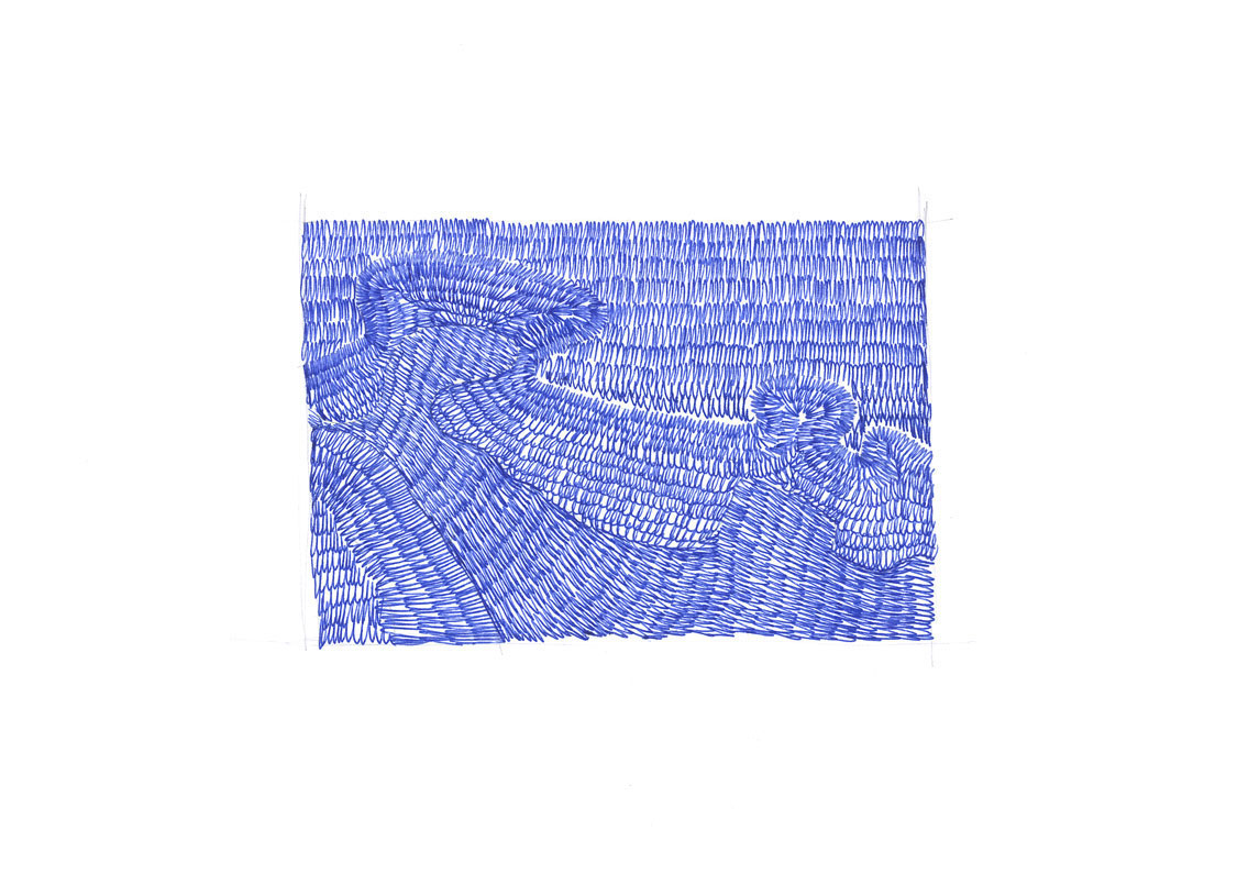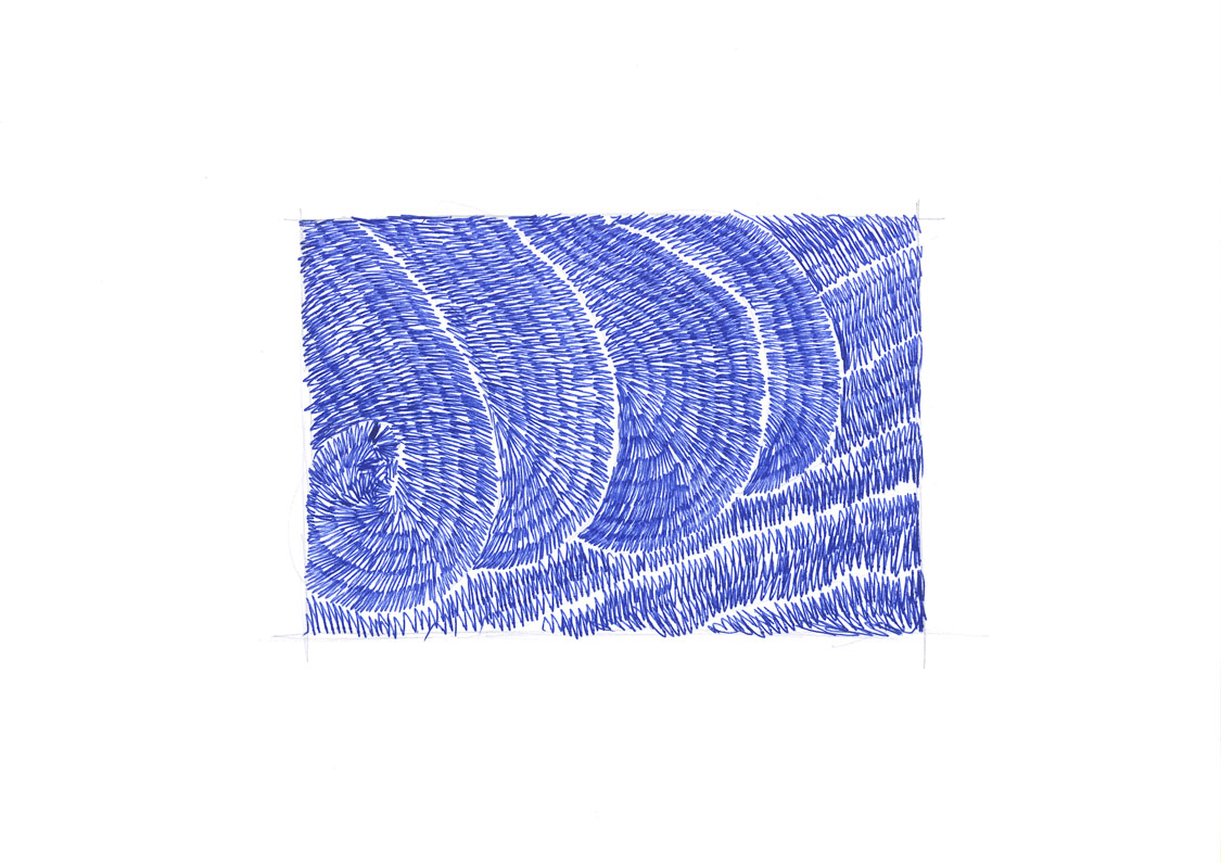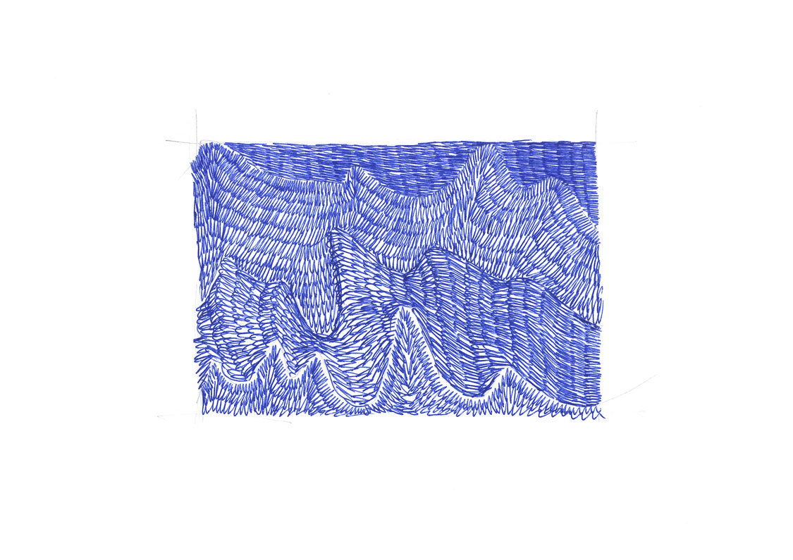 Ces représentations de vagues, falaises et autres paysages côtiers sont réalisées d’une ligne continue comme dans une écriture mouvementée.